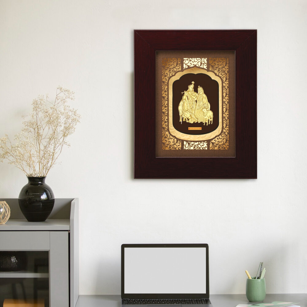 This serene depiction of Radha Krishna with Cow radiates love, purity, and harmony. Ideal for pooja rooms, meditation corners, or serene living spaces, it creates a spiritually enriching environment. Intricate craftsmanship captures divine connection and pastoral calm. Offered by AARYA24KT, this sculpture adds depth and devotion to any sacred or contemplative setting.