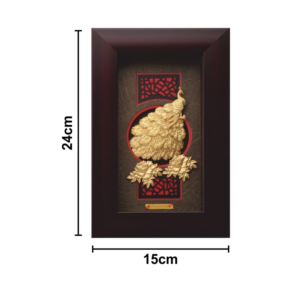 The New Mini Peacock and Peony Frame by Aarya24KT will contribute a touch of sophisticated beauty to your room. With a finely embossed peacock surrounded by blooming peonies, this small masterpiece, which was created using pure 24KT gold foil, combines creativity and meaning. The elaborate craftsmanship produces a lively yet timeless look, complemented by a dramatic red and black design backdrop set within a rich mahogany frame. While the peony flower represents richness, good fortune, and honour in both Indian and Eastern cultures, the peacock has long been associated with beauty, prosperity, royalty, and protection. This frame brings peace, passion, and abundance when positioned towards the southeast or east, according to Vastu and Feng Shui.