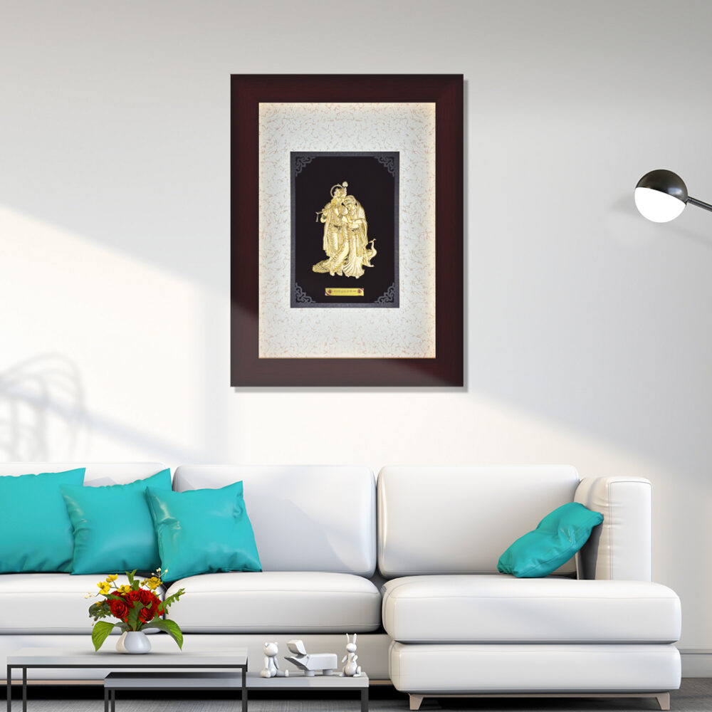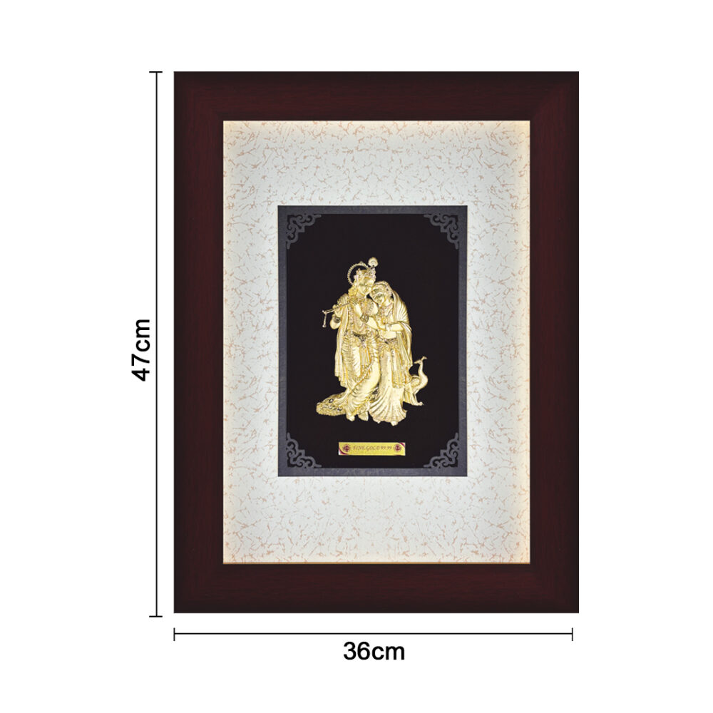 Celebrate eternal love and divine devotion with the Radha Krishna Big Carving Solid Frame by Aarya24kt. Depicting Radha and Krishna in their enchanting form, the artwork is enriched with intricate gold foil artistry and encased in a grand carved wooden frame. Perfect for living rooms, temples, or special occasions like weddings, it radiates spiritual harmony and bliss, offering a piece of Vrindavan’s divine love into your home.