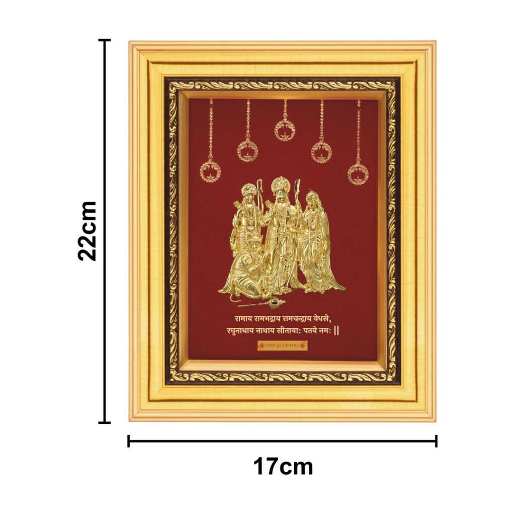 Elevate your spiritual ambiance with the exquisitely crafted Ram Darbar Frame, a divine portrayal of Lord Rama, Sita, Lakshmana, and Hanuman in reverence. Designed with precision and elegance, this frame showcases detailed artistry in fine gold foil against a rich maroon velvet background, symbolizing royalty and devotion. The intricate hanging motifs and regal border enhance its grandeur, making it a perfect centerpiece for your pooja room or a thoughtful gift for auspicious occasions. The Sanskrit shloka below the figures adds sacred vibrance and invokes blessings of peace, prosperity, and protection. Encased in a luxurious golden wooden frame, it blends tradition with timeless style. This divine artwork is not just a decorative piece but a spiritual anchor that reflects your devotion and enriches your space with positivity. Ideal for housewarmings, weddings, or festive gifting, the Ram Darbar Frame is a true expression of faith and craftsmanship