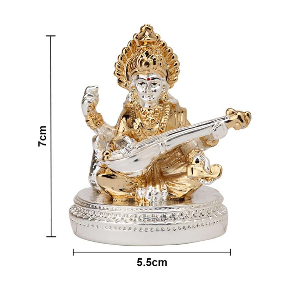 Experience divine blessings with the Aarya24kt Gold-Plated Saraswati Idol, seated gracefully on a round base. Intricately designed, this exquisite 5.5cm x 4cm x 7cm idol radiates wisdom, purity, and knowledge. Perfect for pooja rooms, workspaces, and study desks, it brings positivity and intellect to any space. A cherished gift for students, scholars, and festive occasions, this masterpiece embodies elegance and spiritual grace.