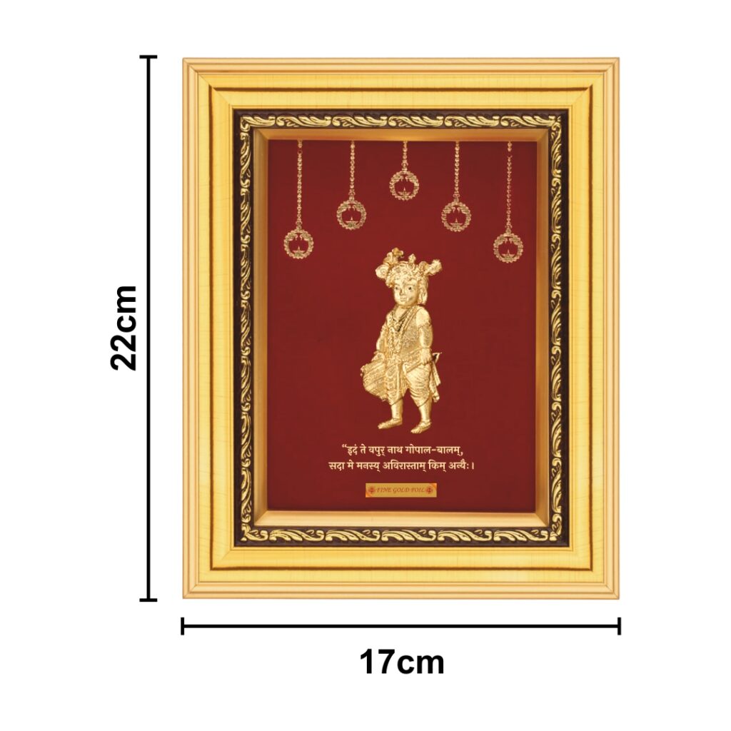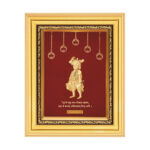 Celebrate the innocence and divine charm of Krishna with Aarya24KT’s Standing Bal Gopal Frame, exquisitely crafted in pure 24KT gold foil. Depicting little Krishna in a playful stance, this artwork symbolizes joy, abundance, and protection. Set against a luxurious maroon velvet backdrop with ornate floral hangings and a devotional Sanskrit shloka, the frame radiates spiritual warmth. According to Vastu, placing Bal Gopal in the northeast direction brings peace, prosperity, and harmony to the home. Perfect for festive gifting or pooja décor, this finely framed piece is a divine treasure of devotion and delightful artistry.