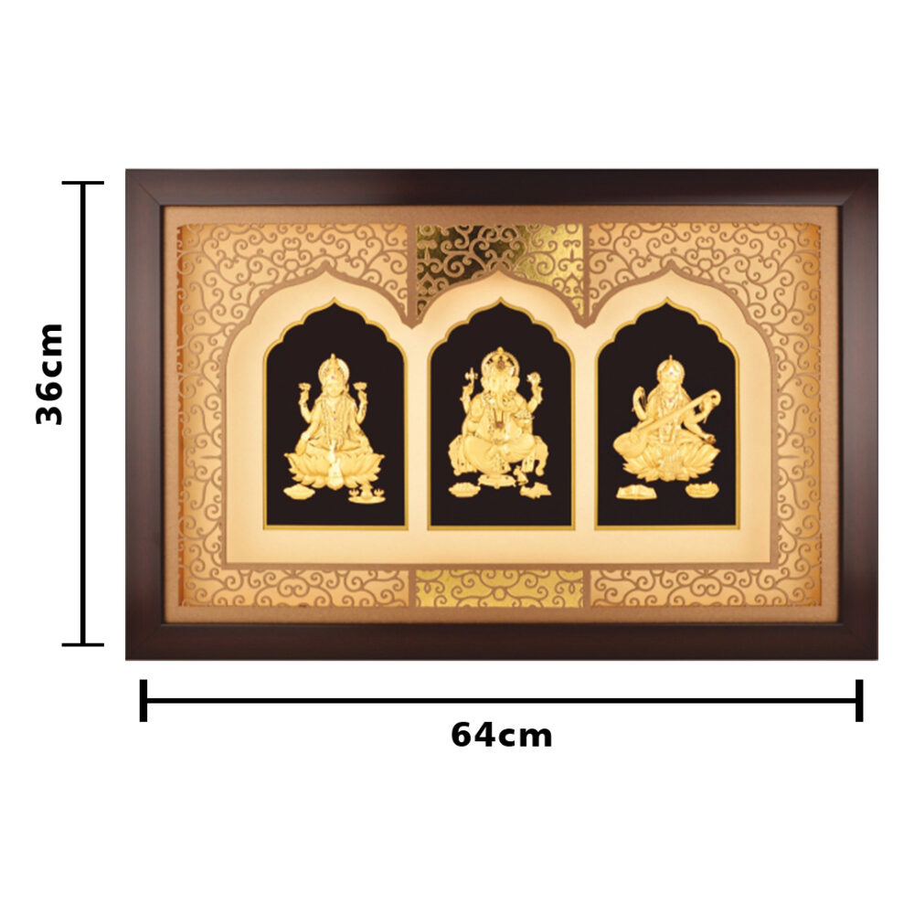 Bring the divine harmony of prosperity, knowledge, and achievement home with Aarya24KT’s Laxmi, Ganesh, and Saraswati Trio, exquisitely framed in a medium-carved temple design. Crafted in gold foil, Goddess Saraswati fosters creativity and knowledge, Lord Ganesha removes barriers, and Goddess Laxmi provides wealth. Placing this trio on the north-east or east wall of your house, workplace, or study area, according to Vastu, stimulates the space with abundance, intelligence, and happiness. With its elaborate details and rich background, the frame highlights the golden gods. This artwork is perfect for pooja rooms, foyers, or auspicious gifts during festivals and festivities. It is a luxurious décor piece as well as a spiritual symbol. An enduring work that successfully combines commitment and design.
